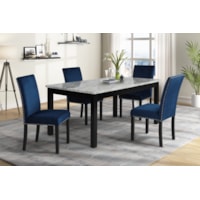 This set adds a touch of glamour to your home. The Faux Marble top is a beautiful white and gray pattern that is set off by the black solid wood table frame. The Top is heat and water-resistant, super easy to care for, and a statement-making design. The table is surrounded by upholstered velvet chairs, made of solid wood and with side, front and back stretchers for strength and durability. The plush memory foam cushion is so comfortable, and the silver nail-head trim accents both the chair and the marble top.